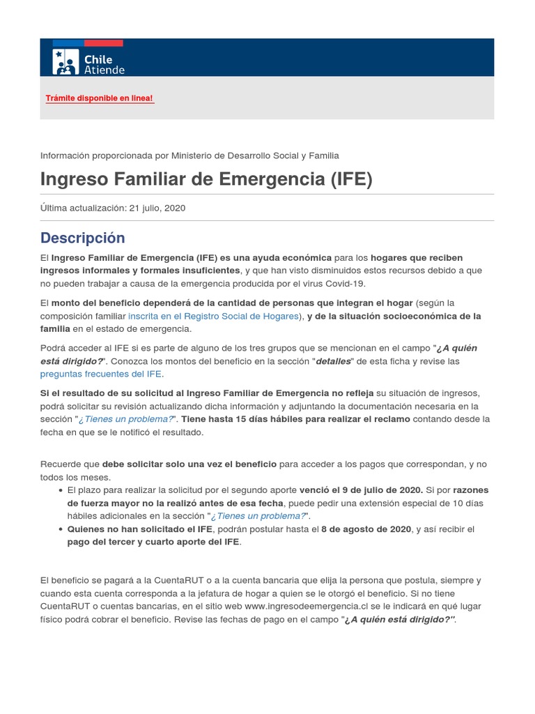 Para recibir el quinto y el sexto aporte tienes hasta el 7 de octubre de 2020. Entra a ingreso familiar de emergencia para postular y conocer más sobre este nuevo apoyo para las familias con ingresos informales. En caso de no disponer de esa información se utilizará la información disponible en las bases administrativas del ministerio de. Ingresodeemergencia.cl is a government website. Solicitar el beneficio en la plataforma web www.ingresodeemergencia.cl 2.
